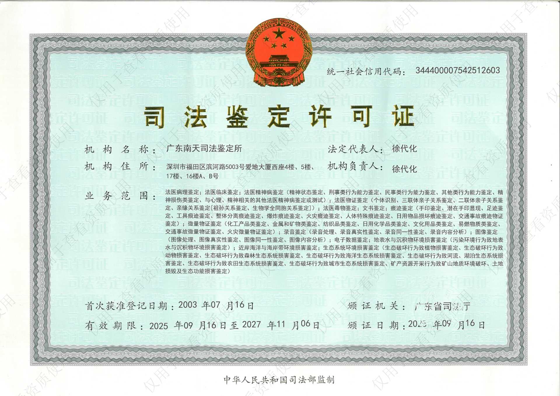 广东南天司法鉴定所于2003年经广东省司法厅核准设立,集司法鉴定服务与法庭科学技术研发为一体。总所位于深圳市福田区,现有办公场地3500㎡,其中科研实验室面积1200㎡,同时在河源、江门、韶关设立分所。